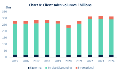 The stock of total advances at the end of 2024 at £21.2 billion was 4.4 per cent up on the same period a year ago and just around £0.5 billion lower than at the end of 2019. This stands in contrast to the gap in activity seen in other lending products across the main high street banks since the end of the pandemic and is a sign of the relative resilience of invoice finance and asset-based lending products.