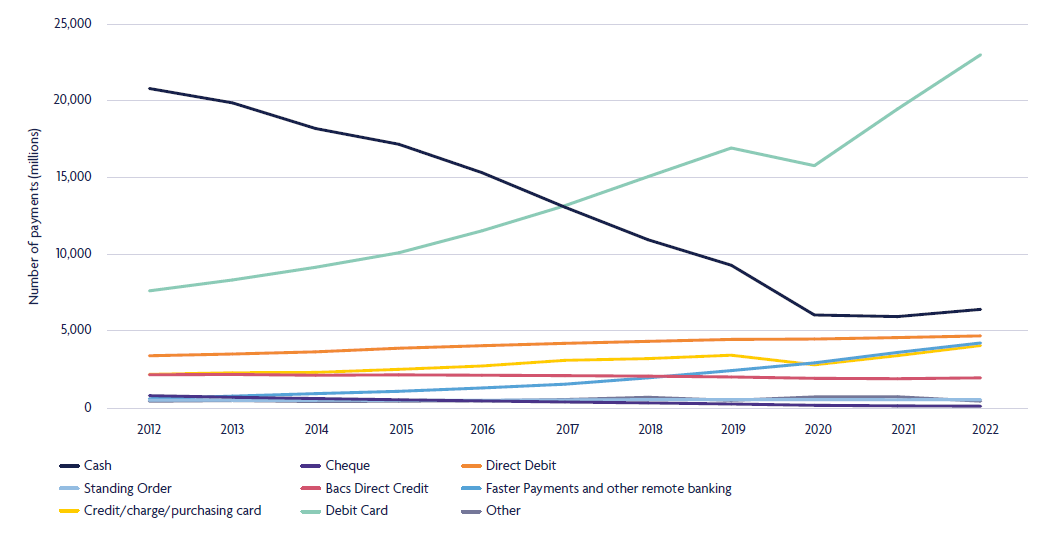 The long-running trend in cash has been one of continued decline, although it remains the second most frequently used payment method.