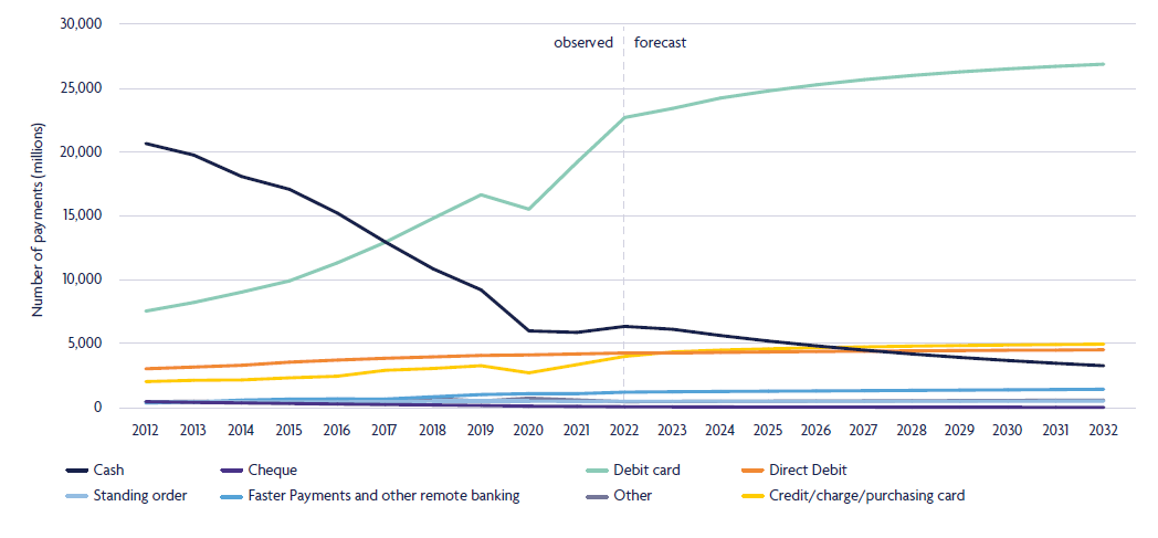 Over the next decade, we expect to see a continuation of current trends, with debit cards becoming ever more popular and cash usage falling as shown in the graph below.