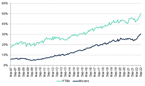 The data also shows that the average income of new borrowers has risen. The average household income of a first-time-buyer mortgage application in Q3 2022 stood at just under £60,000. This is 17 per cent higher than the same quarter last year. During this time, wage growth was well below this rate, indicating a shift towards higher income households entering the market as lower income households struggle to get onto the housing ladder.