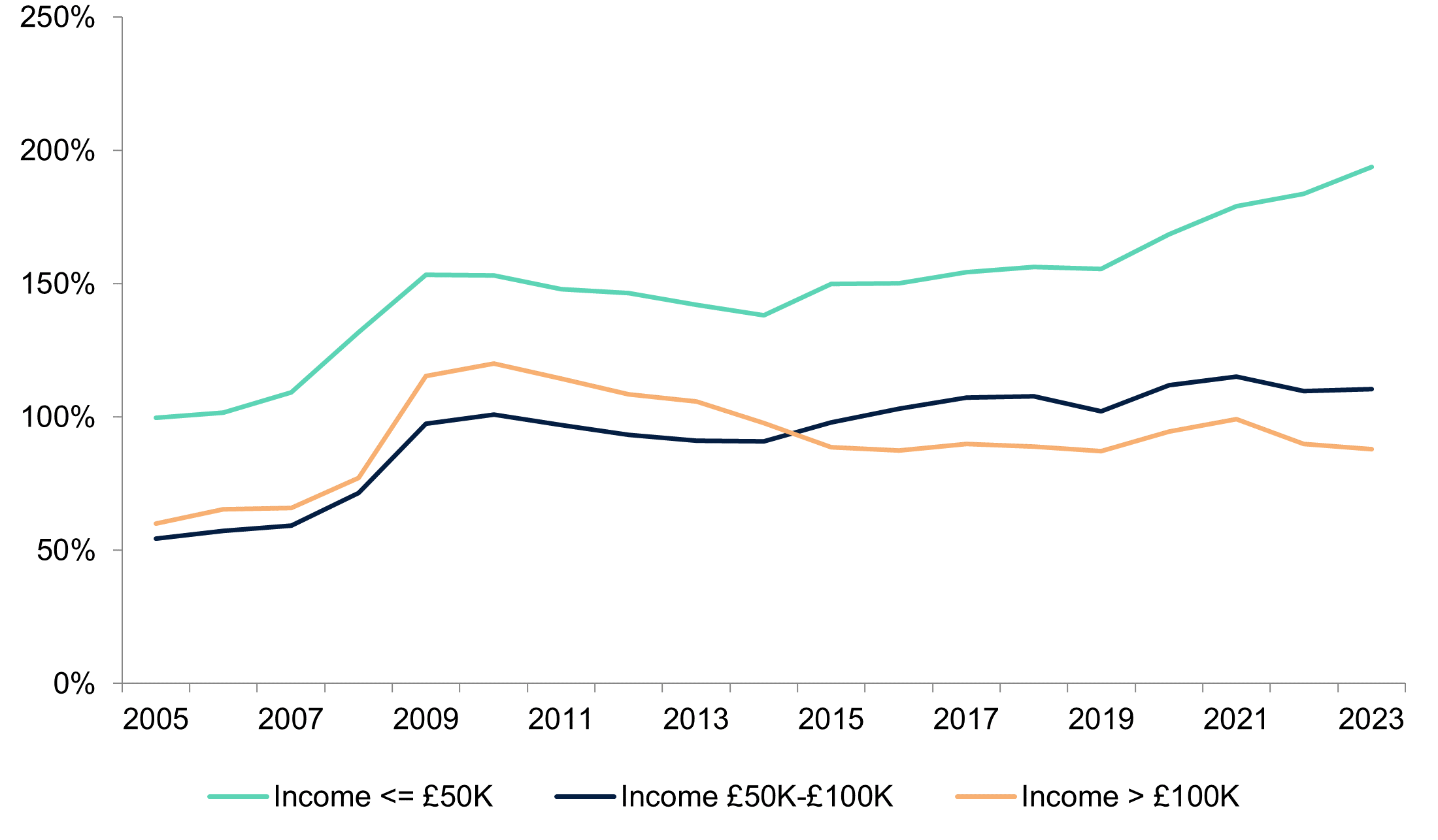Mortgage lending was weak in almost every segment of the market but can be seen most acutely in the tighter end of affordability. In 2021, 57 per cent of first-time buyers had household incomes of less than £50,000. In 2023, this number fell to 46 per cent, and these customers are now having to put down deposits equal to twice their annual earnings, significantly more than in recent years. However, borrowers with higher incomes have not seen the same shift in increased deposit requirements.