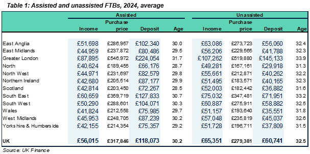 We looked at assisted and unassisted buyers in terms of deposits, age, household income and purchase price in 2024 and found notable differences across these in each region of the UK as shown in the table below.